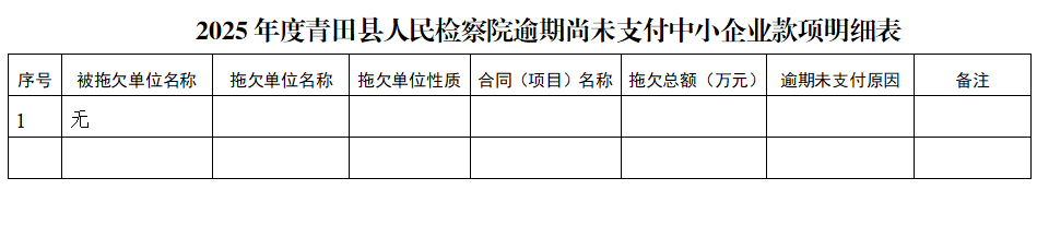 2025年,青田县人民检察院根据国务院及省委省政府清理拖欠企业账款有关工作要求,积极开展防范和化解拖欠中小企业账款工作。截至20251231日,本单位逾期尚未支付中小企业款项情况见附件表格。